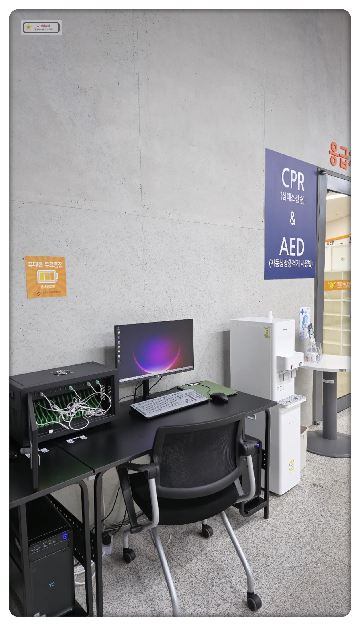 응급처치 전문 체험장 옆에는 휴대폰 충전소가 있습니다.