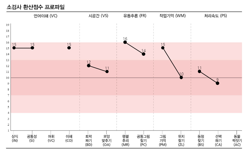 시공간, 처리속도 지표의 점수가 약한 것을 볼 수 있습니다.