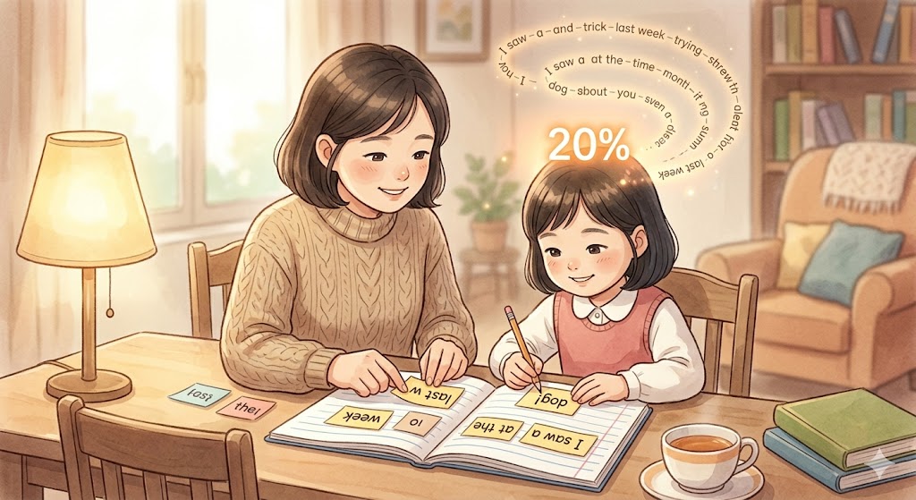 문장 전체를 만드는 부담은 엄마가 80% 가져가고, 아이는 마지막 성공 경험 20%만 가져가게 하는 전략입니다.