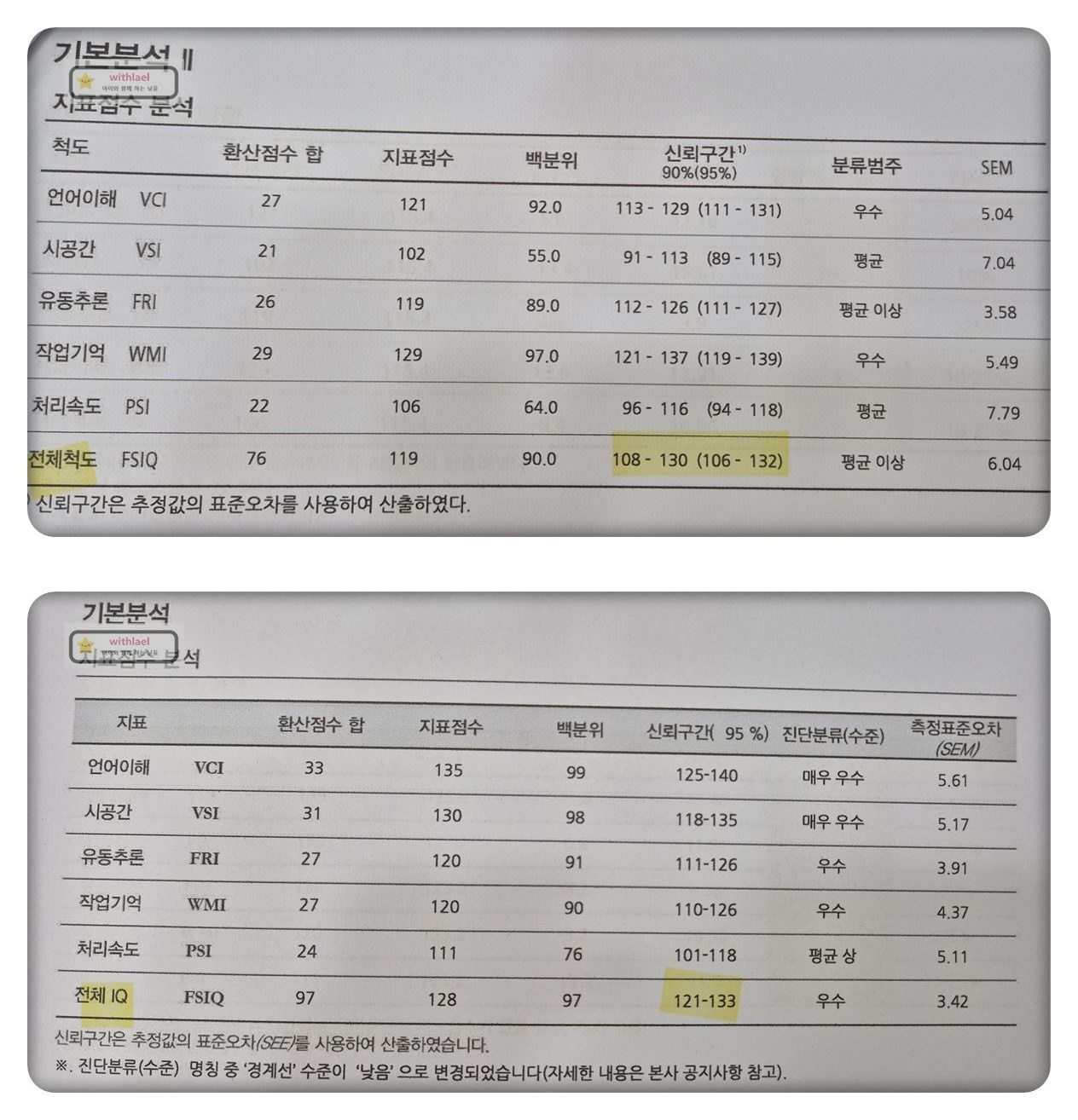 윗 사진: 웩슬러 유아검사 결과지, 아래 사진: 아동검사 결과지