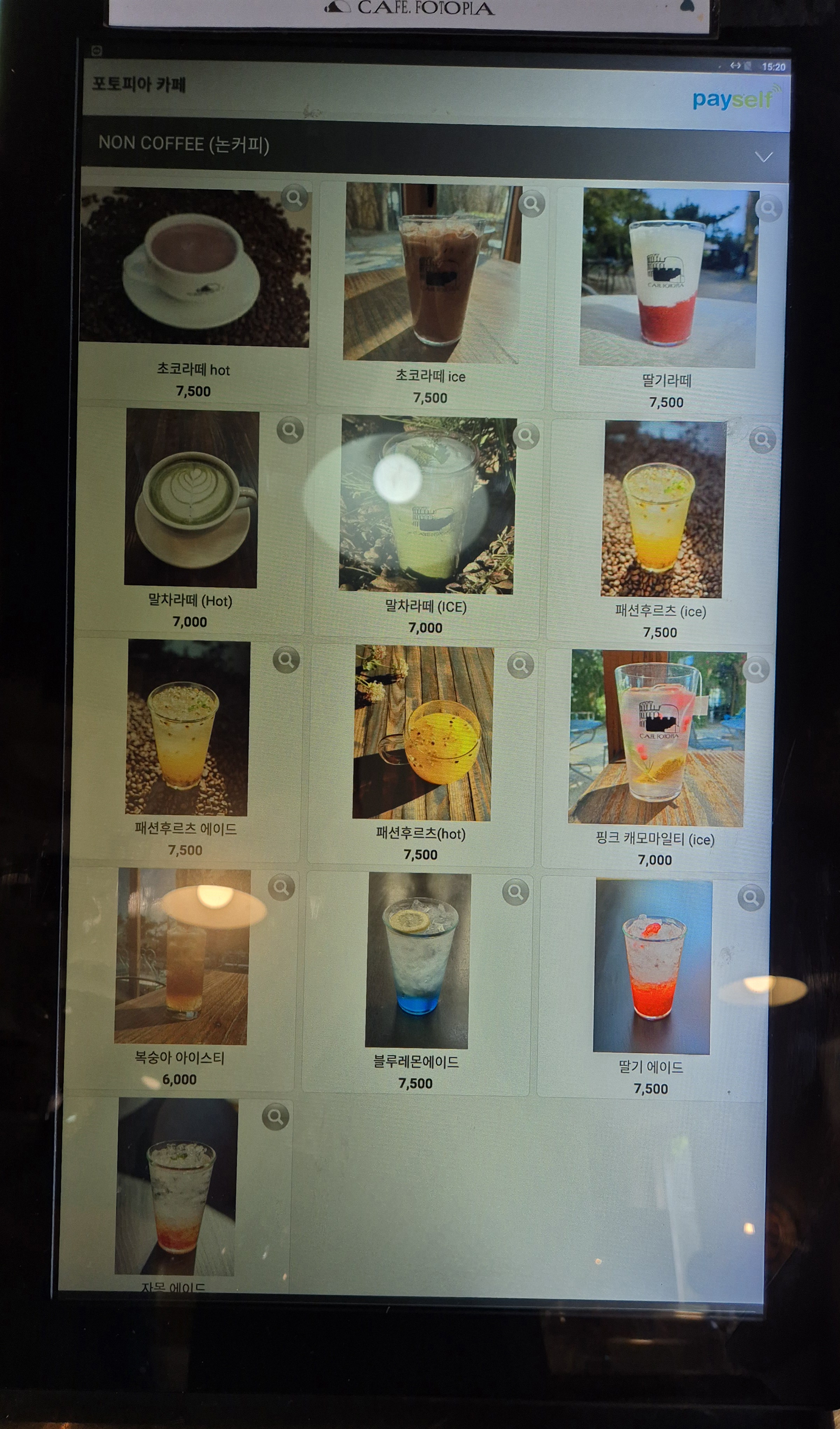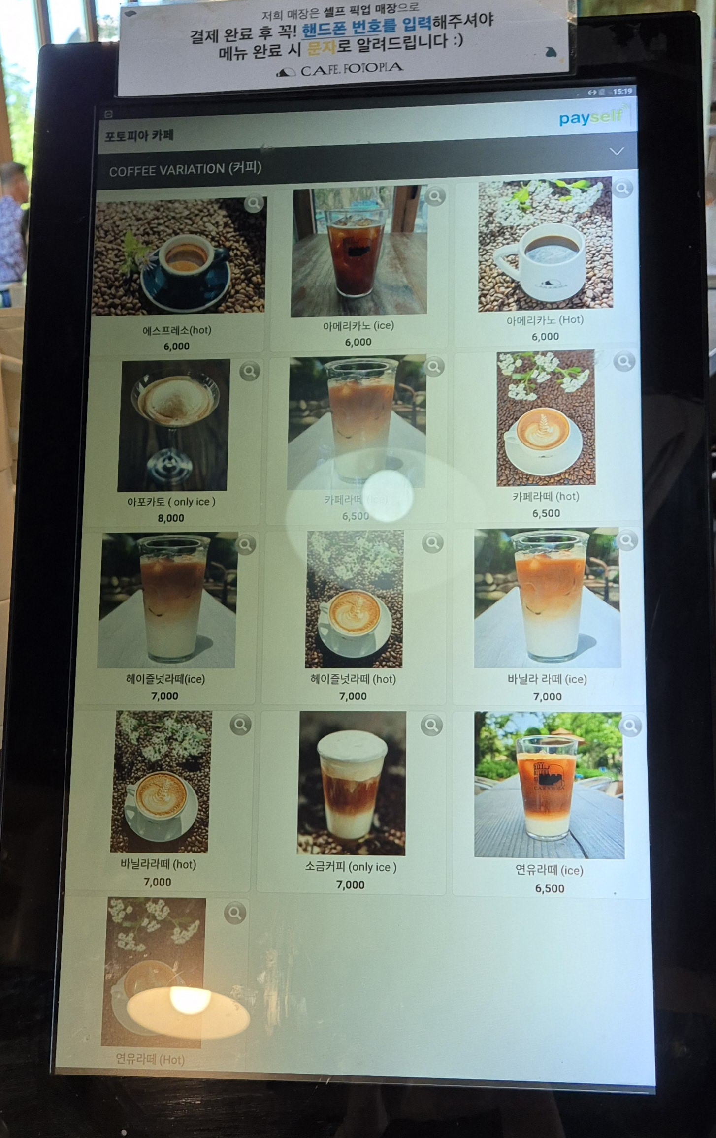 메뉴 사진은 대략 이렇습니다. (전부는 아닌 것 같습니다.) 주문을 하고 전화번호를 입력하면 음료가 준비되었을 때 문자로 알려줍니다.