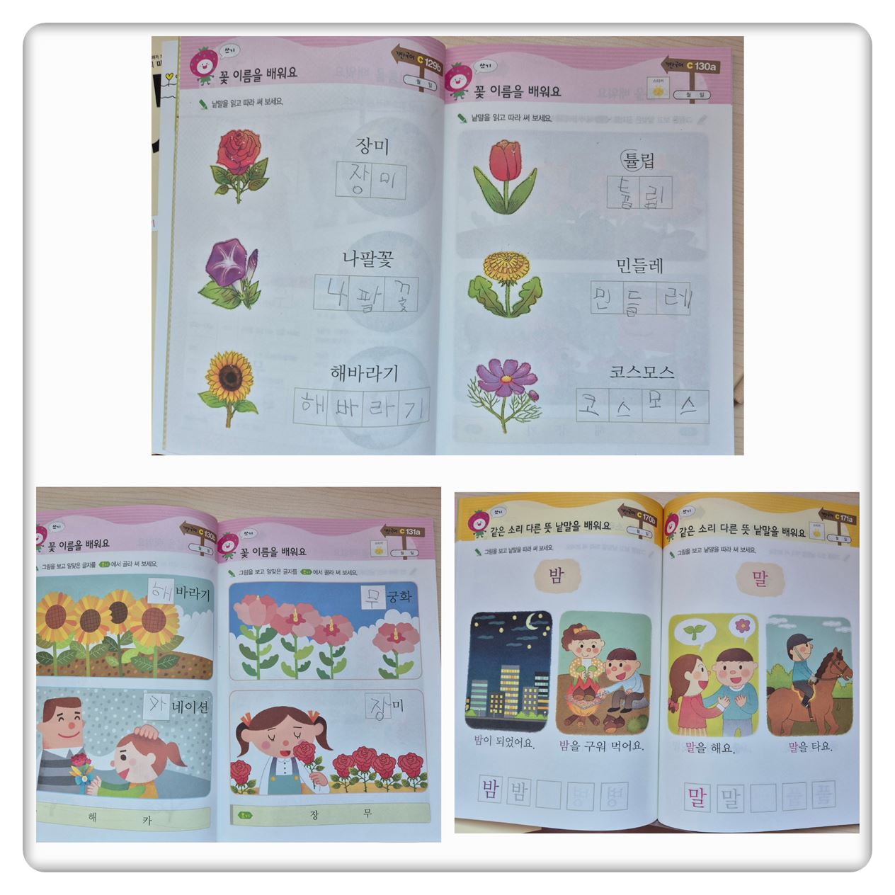 쓰기 파트에서 반대어, 동의어 등으로 익히며 쓸 수 있거나, 꽃이름 동물이름 등으로 분류하여 쓰기 공부를 할 수 있어서 쓰기 뿐 아니라 단어공부에도 효율적입니다.