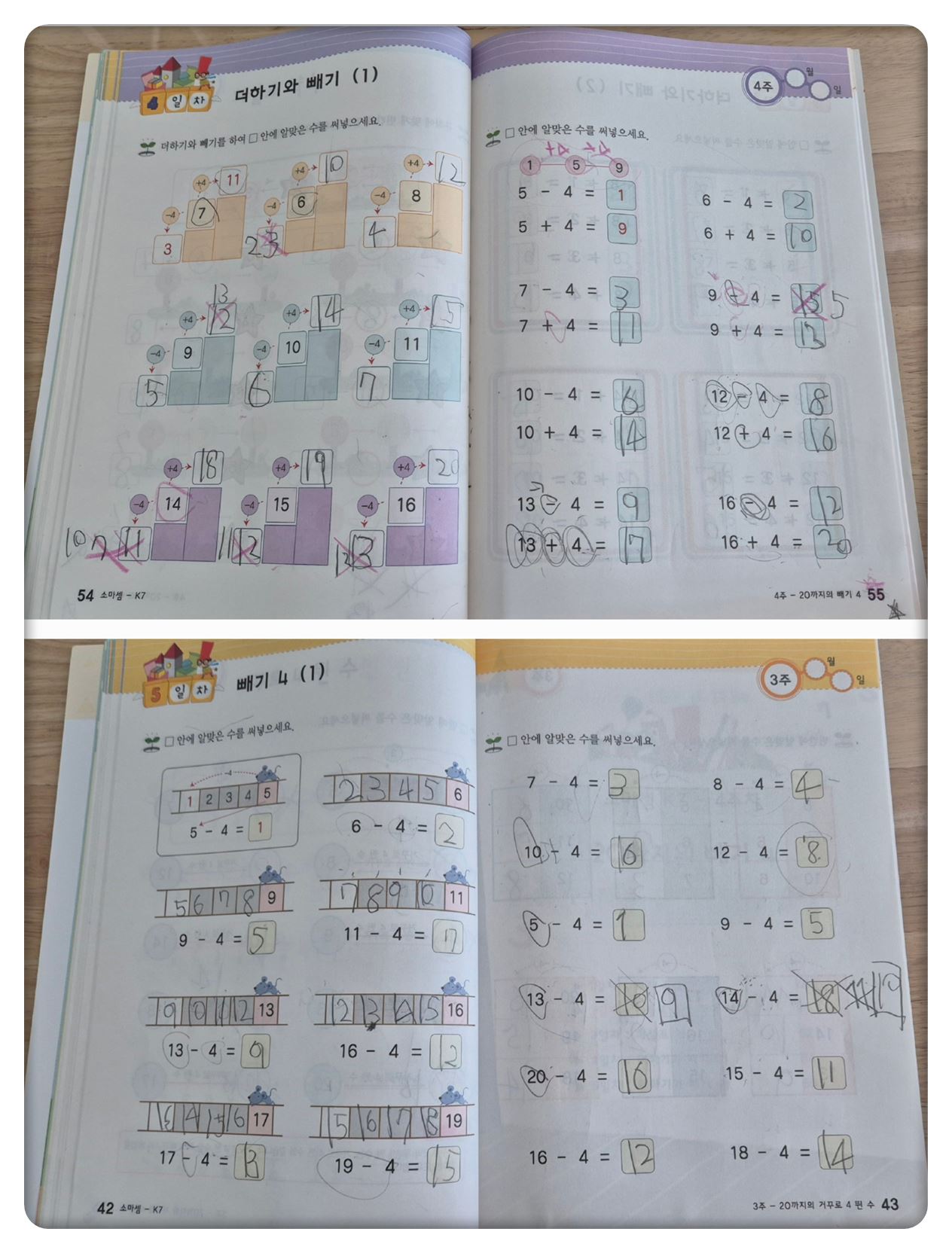 소마셈 K7교재에서 더하기, 빼기 4까지 진행하니 수 가르기, 모으기, 문장제 문제 파트가 나왔습니다.