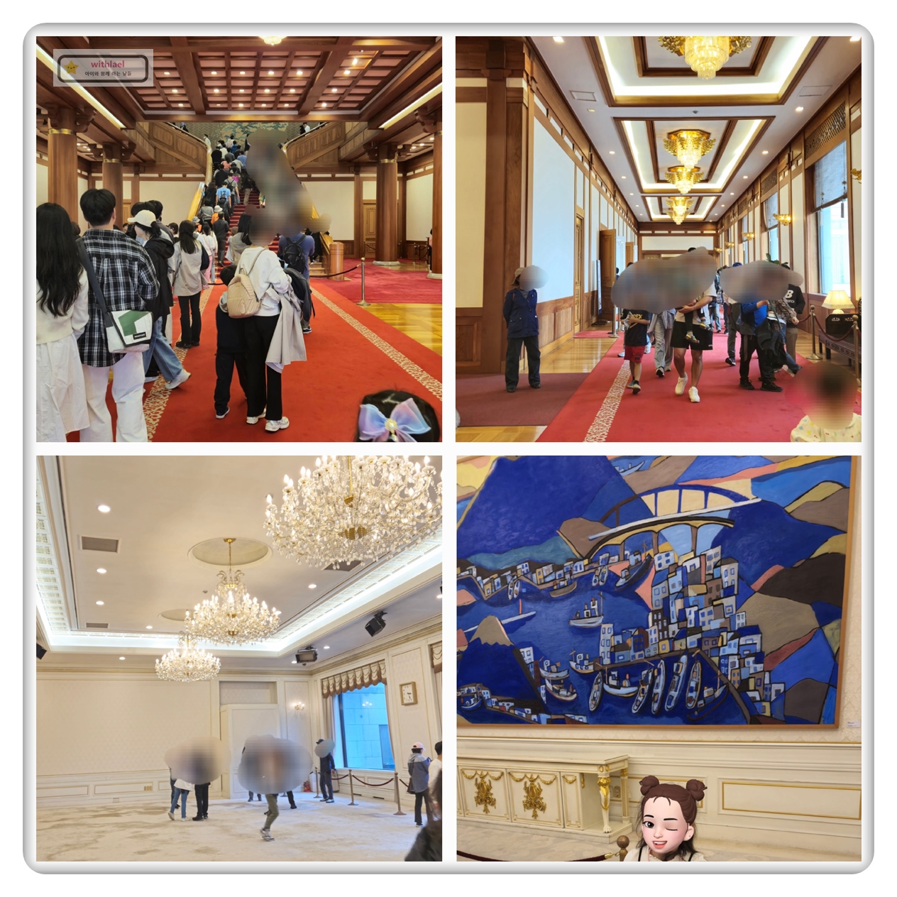 저는 유모차를 가져가서 엘리베이터로 이동했는데요, 청와대의 중간계단에는 큰 그림이 있고 샹들리에도 화려하여 걸어서 올라가는 게 더 낫겠다는 생각을 했습니다.