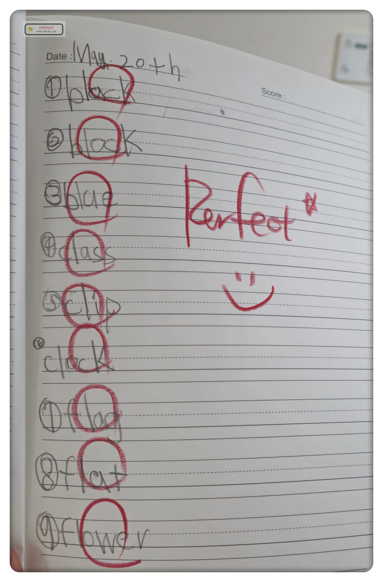 4월부터는 show & tell을 진행하며 문장을 외웠고, 5월부터는 단어시험을 시작하였습니다.